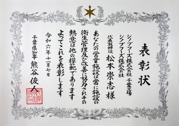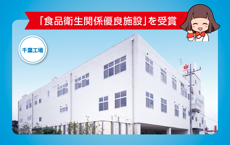 千葉県では、食品衛生の普及向上、食品衛生行政に対する協力及び業界の指導育成等に顕著な功績があった施設の労苦に報いるとともに、優良な食品衛生施設について他の模範になると認められた施設へ「千葉県食品衛生大会」において、知事表彰が行われており、この度、当社千葉工場が保健所からの推薦を受け、「食品衛生関係優良施設」を受賞いたしました。